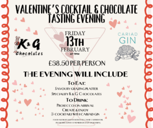 Join us alongside two amazing local businesses; K & G Chocolates and Cariad Gin  for our  Cocktail and Chocolate Tasting evening.